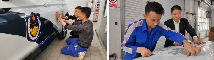 圖5為:售后漆工冶龍正在為警車貼警徽標(biāo)志,他說:“警車是公務(wù)用車,每次粘警飾我都感到很神圣,干活兒特別用心細(xì)致,一定要把車身警飾做得非常好才行。警徽閃耀,守望千家萬戶。我是漆工也是工匠,必須精益求精,把活兒干漂亮,這也是汽貿(mào)漆工的臉面。每次我都把車清洗干凈,用卷尺量好間距,用記號筆畫好。在貼的過程中用刮板反復(fù)擠壓空氣,這樣才能使警徽粘得更牢固更美觀。我要把公司倡導(dǎo)的勞動精神、工匠精神,通過不斷地學(xué)習(xí)鍛煉,提高本領(lǐng),把精湛的工匠手藝和貼心的服務(wù)傳遞給社會。